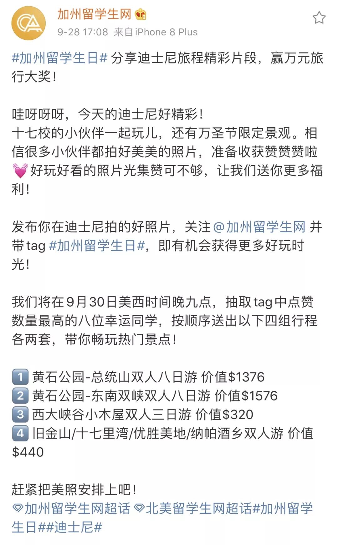 2019年9月28日活动结束后“加州留学生网”微博发起#加州留学生网 的tag,十七校的小伙伴踊跃参加,来让我们看看大家的游玩感想吧!