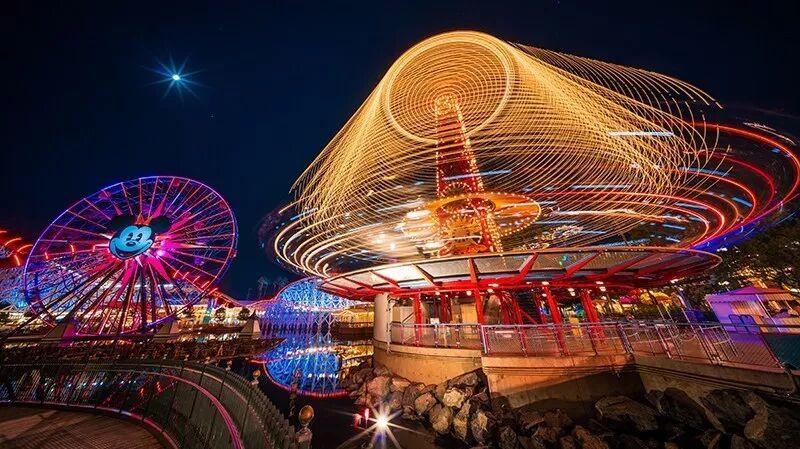 夜色将至,迪士尼的夜灯都亮了起来。摩天轮和过山车的灯光更加绚丽夺目了。摩天轮上米奇的标志成为冒险乐园的经典取景地